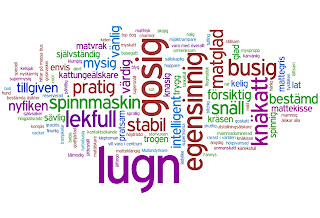 Det store tekstmotivet på kortet har blitt til å en veldig artig måte; Jeg er med i et svensk Forum for Britte-oppdrettere/intresserte og der ble vi utfordret av et medlem om å beskrive vår Britte med tre ord. Dette var det mange av oss som gjorde, og så har hun satt sammen alle ordene på dette nettstedet: http://www.wordle.net/