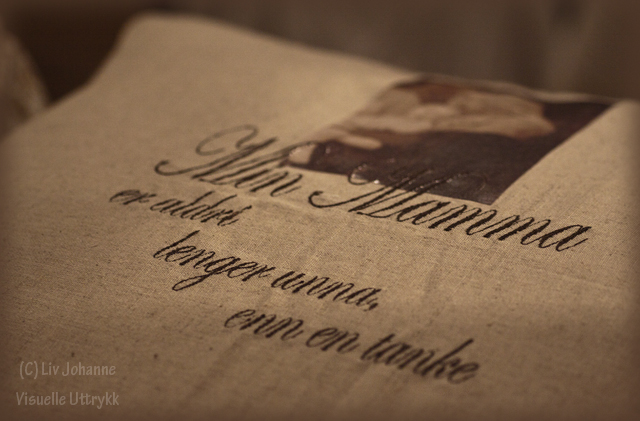 -Dagens bilde er nok helt sikkert ikke et av de mest geniale bildene jeg har tatt,- men det er derimot teksten på denne pynteputa... "Min Mamma er aldri lengre unna enn en tanke.."